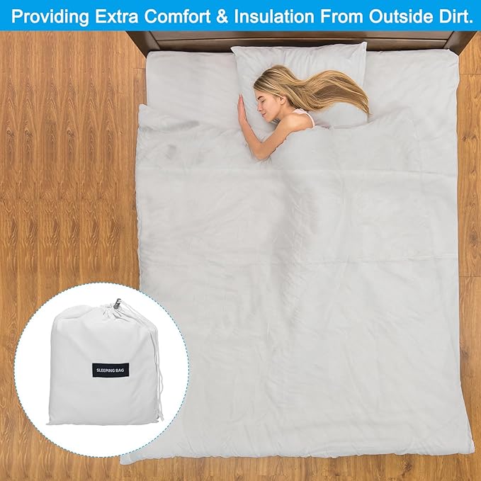 - Application: Our sleeping bag liner is an essential accessory for any camping or travel enthusiast. It is used as a lining for sleeping bags, providing extra comfort and insulation from outside dirt. Widely used in camping, traveling, hotel, train, etc. or as a replacement for bed covers at home.