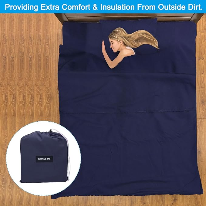 - Application: Our sleeping bag liner is an essential accessory for any camping or travel enthusiast. It is used as a lining for sleeping bags, providing extra comfort and insulation from outside dirt. Widely used in camping, traveling, hotel, train, etc. or as a replacement for bed covers at home.