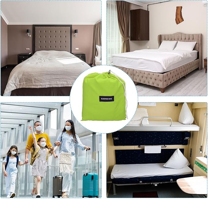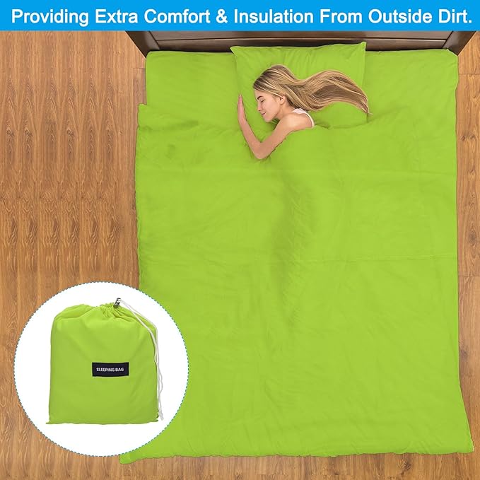 - Application: Our sleeping bag liner is an essential accessory for any camping or travel enthusiast. It is used as a lining for sleeping bags, providing extra comfort and insulation from outside dirt. Widely used in camping, traveling, hotel, train, etc. or as a replacement for bed covers at home.
