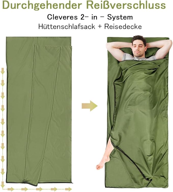 - Full Length Zipper - Our sleeping bag liner is designed with a convenient full length zipper that extends to the side and bottom for easy access. If fully unzipped, it can also be unfolded to use it as a spacious bed sheet. It's a great partner for your hotel or hostels stay!