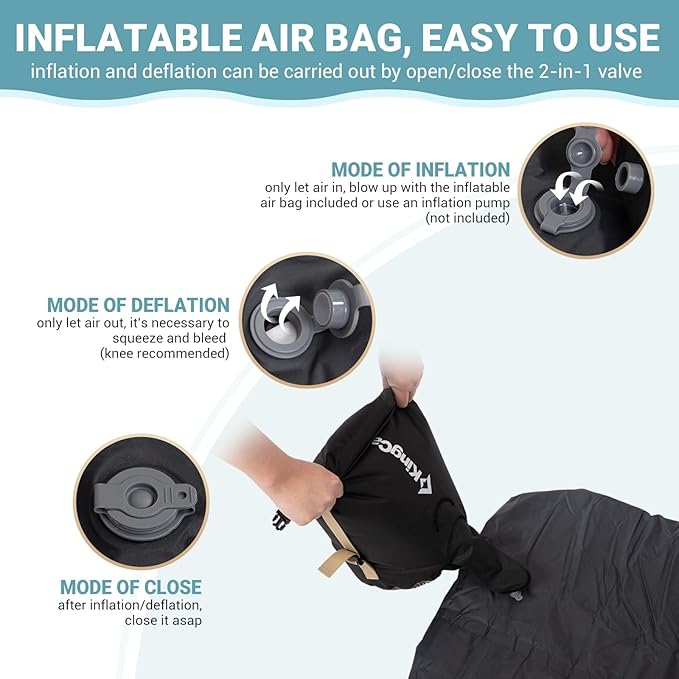 - 【Easy Inflation and Deflation】Our dual-layer air valve allows for fast and stable inflation and deflation. The outer layer opens easily for quick inflation and prevents leaks. To deflate, simply open the valve completely. With a Pump Sack for quick inflation, you'll be ready for your outdoor adventures with our memory foam camping pad in no time.