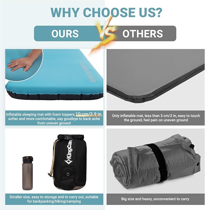 - 【Experience Ultimate Comfort】KingCamp's self-inflating sleeping pad is an unmatched camping experience. At 4" thick, measuring 76" x 26" x 4", it creates a comfortable space that won't touch the ground no matter how much you move. With a soft, stretchy top layer, enjoy a good night's rest in silence.