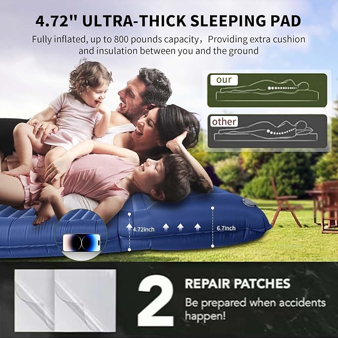 Double Sleeping Pad,4.75" Ultra-Thick Self Inflating Sleeping pad for Camping, with Pillow Built-in Foot Pump Camping Mattress for Backpacking, Car Camping, Hiking, Tent(Double Blue)