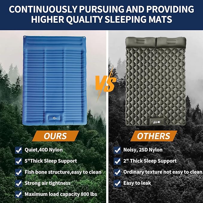 - TOP COMFORTABLE AND DURABLE: Our sleeping pad is made of ultra-tough 40D nylon coated with water-resistant TPU, durable and tear-resistant. This camping pad also features unique drawstring support technology. The air support units independently deform to conform to your body's curves and distribute gravity, and can hold up to 800 pounds of pressure when fully inflated. The edges of the camping air mattress are heat-sealed so you don't have to worry about air leaks or tears.