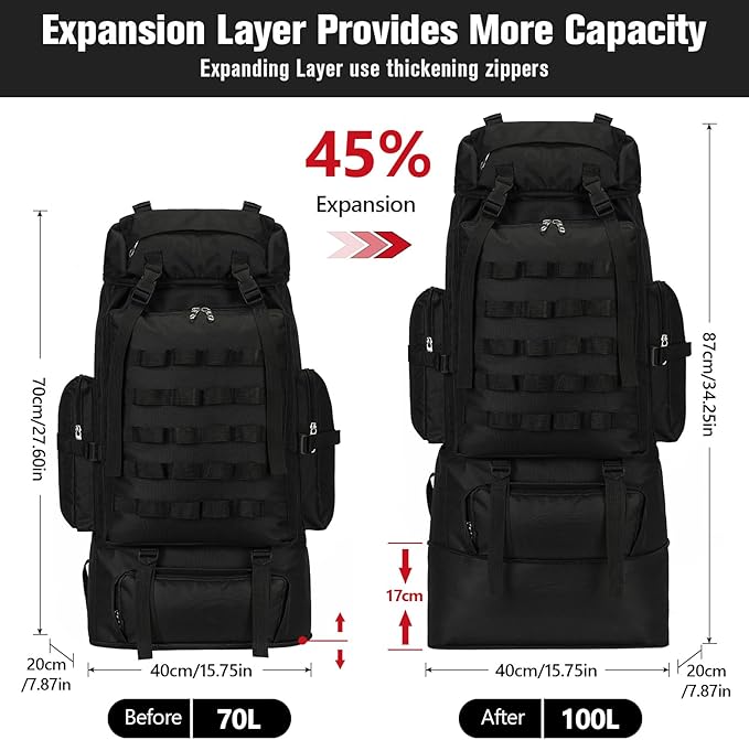 - 【Size & Lightweight】: The expanded size (100 liters) is 34.2*15.8*7.87inchs, ordinary dimension (70 liters) is 27.5*15.8*7.87inchs; This mountaineering backpack weighs only 3.3lb/1.5kg for easy carrying, and adding no burden to your travel. Perfect size for camping backpack, hiking backpack, trekking backpack, traveling, hunting, fishing.