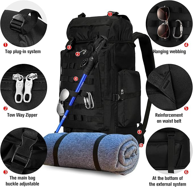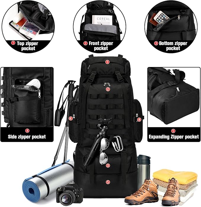 - 【Expandable Hiking Backpack】: The large capacity camping backpack with bottom zipper for expansion, you can chooes 70L or 100L according your need. The main storage bag with elastic drawstring is spacious enough to fit into sleeping bags, cushions, hammocks, and luggage, one front zipper pocket ideal for quick-grab essentials, One bottom pocket for storing items separately, and two side pockets perfect for keeping hydration within reach with water bottles or umbrellas.