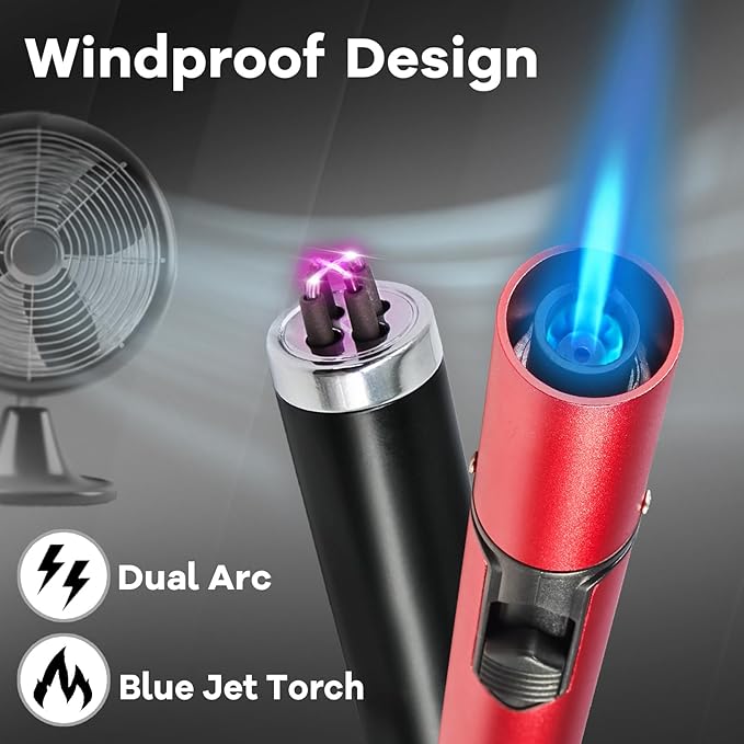 - BLUE JET FLAME & DUAL ARC FLAMELESS - The torch lighter can create a blue jet flame up to 2.8 inches with a temp of 2800°F. The electric lighter can product flameless dual-arc. They are both windproof and the perfect tools for lighting under bad weather