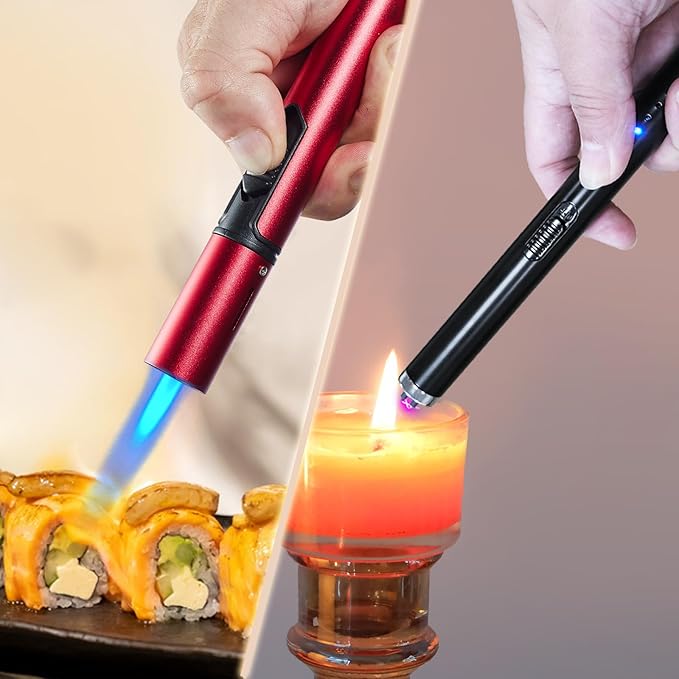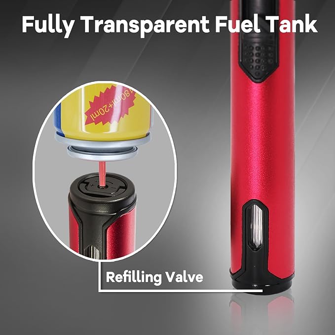 - REFLLABLE & ADJUSTABLE - The refill valve at the base allows you to refill the torch lighter whenever needed, ensuring long-term use. Our butane torch lighter also has an adjustable flame, allowing you to choose between a high and low flame. NOTE: TORCH LIGHTER WILL BE SHIPPED UNFILLED. PLEASE FILL WITH FUEL BEFORE USE