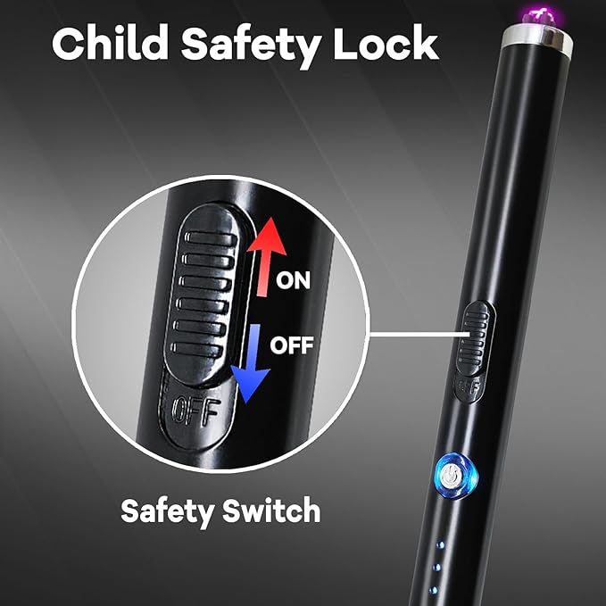 - CHILD SAFETY LOCK - The ARC lighter features automatic power-off chip and an external safety lock switch, effectively improving safety. You need to push the safety lock switch first and then use it. And the dual arc will automatically stop after 7 seconds of ignition