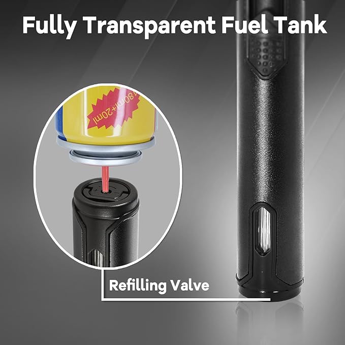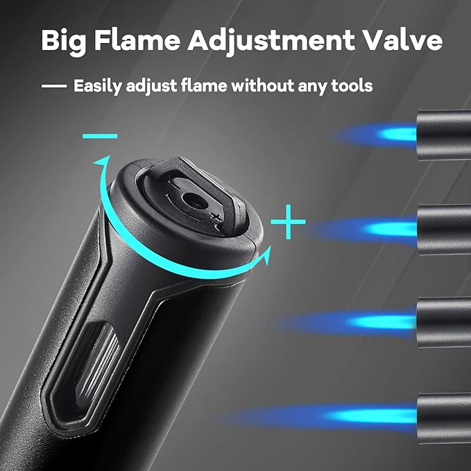 - REFLLABLE & ADJUSTABLE - The refill valve at the base allows you to refill the torch lighter whenever needed, ensuring long-term use. Our butane torch lighter also has an adjustable flame, allowing you to choose between a high and low flame. NOTE: TORCH LIGHTER WILL BE SHIPPED UNFILLED. PLEASE FILL WITH FUEL BEFORE USE