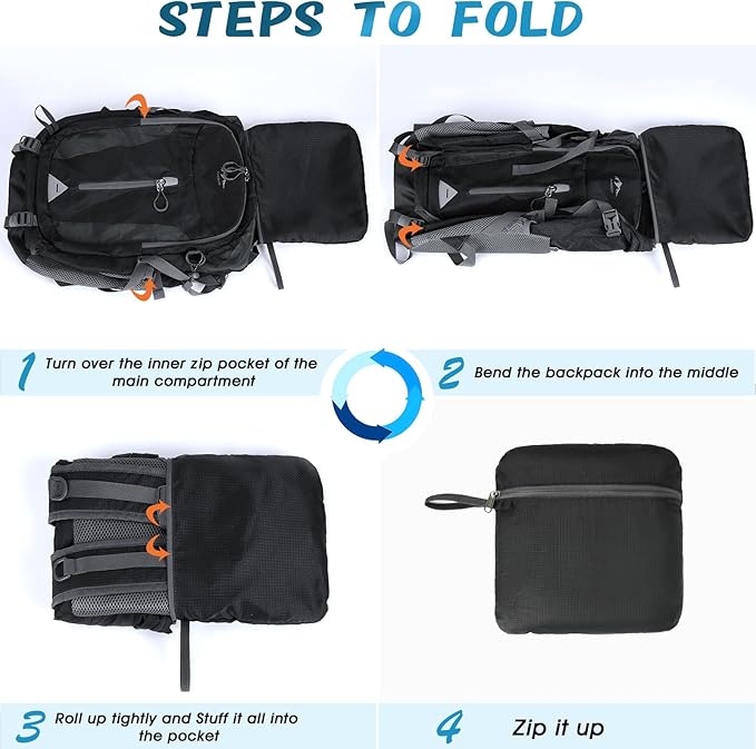 - 【Durable & Lightweight Hiking Backpack】This hiking backpack is made from highly tear-resistant and waterproof nylon fabric that is quick-drying and can be quickly reused after being washed.Hiking backpack's two-way smooth SBS metal zipper has a drawstring design, and all stitches are reinforced with a new double-layer wear-resistant process to ensure that hiking backpack is durable and provides a good experience.This ultra-light portable backpack(weighs only 0.5kg) allows you to travel lightly.