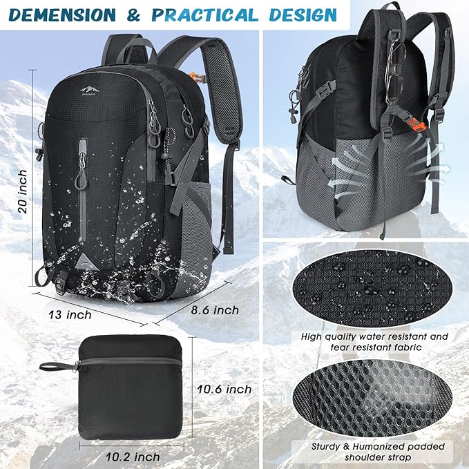 - 【40L Hiking Backpack】The dimensions of the hiking backpack men is: 13"(L) x 7.9"(W) x 17.7"(H),with 40L storage space,this hiking daypacks features with multi-compartment design includes a roomy main compartment,3 zippered front pockets, 2 side pockets and a waterproof wet pocket.Reasonable compartment design allows this hiking backpack to store trail snacks, ropes and other standard tools in an organized manner, making it the perfect portable backpack for climbers.
