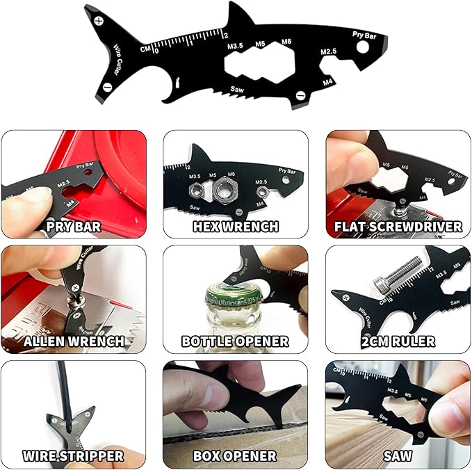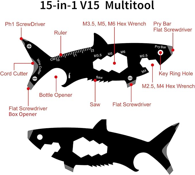 - 「 EDC Multitools Weight 」- 15-in-1 Shark Shape Multitool is 14g(0.03lb). They can be brought anywhere with you.