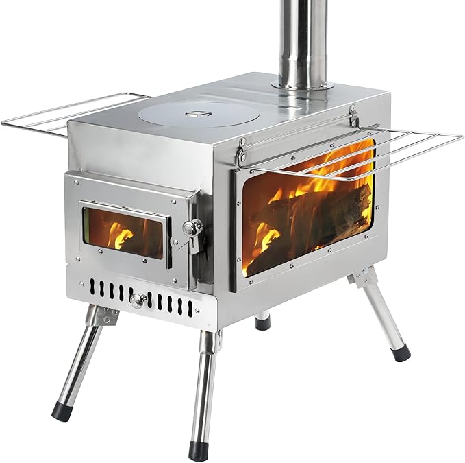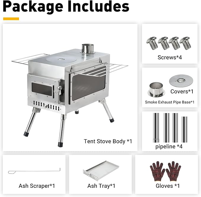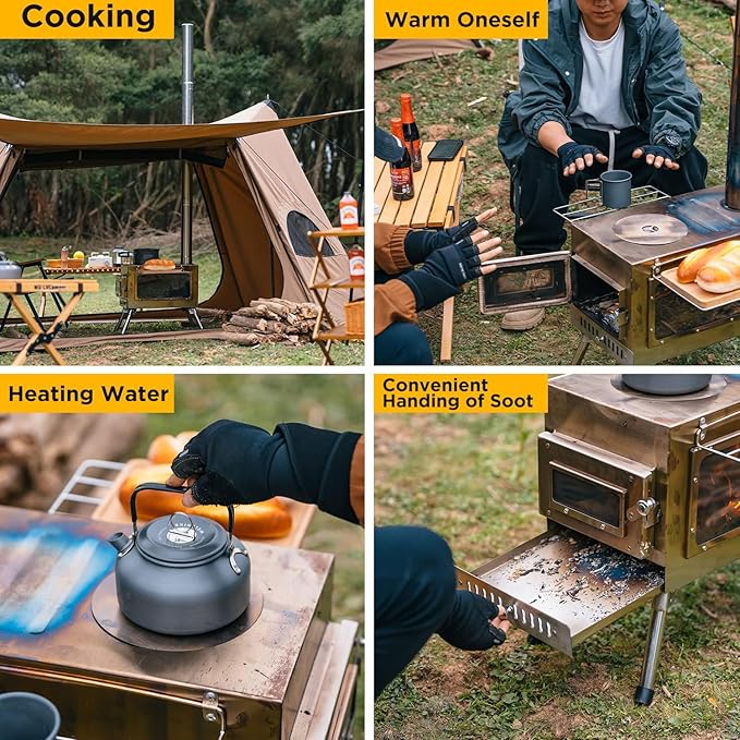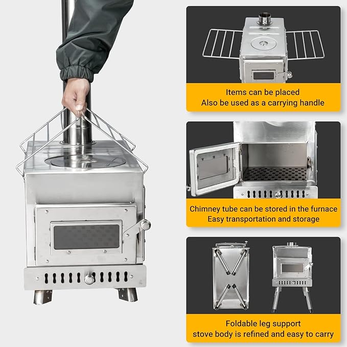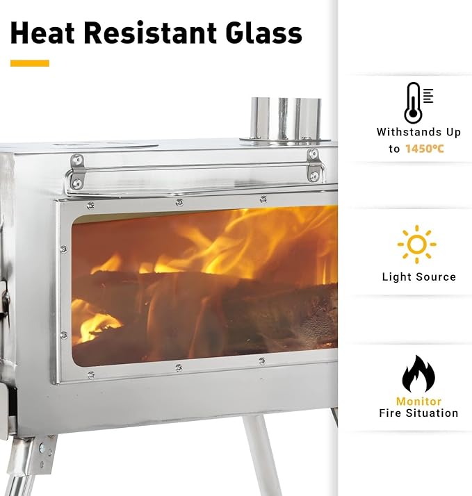 - ⛓【Stainless Steel Chimney Pipe】-- Equipped with 4x chimney pipes for stability and proper ventilation. Available for bell tents with furnace tube vents; chimney tubes adjust ventilation to suit your heat needs. The design of the fire holes on the surface of the stove also increases the heating efficiency and is a great version for your camping/hunting trips with friends or family.