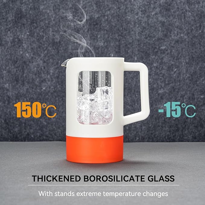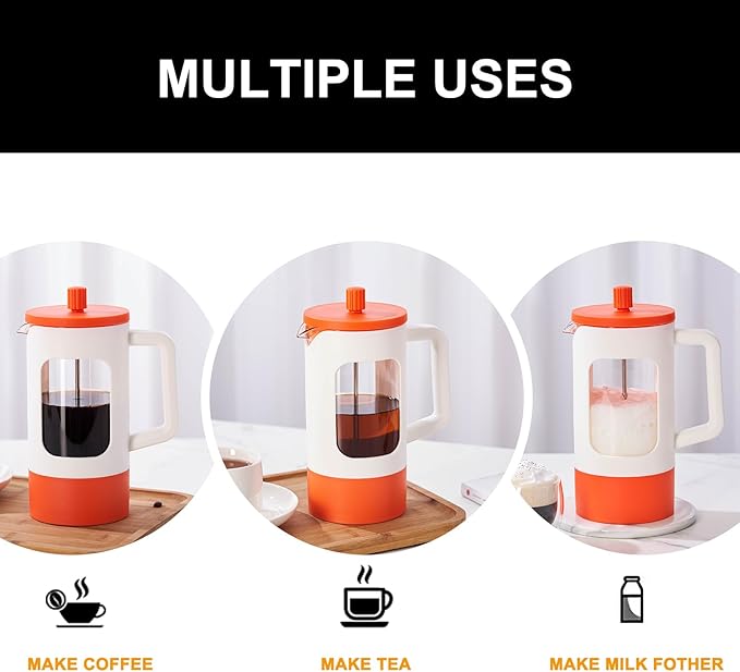 YOLIFE French Press Coffee Maker, 34 oz / 4 Cup Coffee Tea Press with Heat-resistant Borosilicate Glass, 4-Level Filtration Systems, Cold Brew Coffee Maker for Camping Travel Gifts, White and Orange
