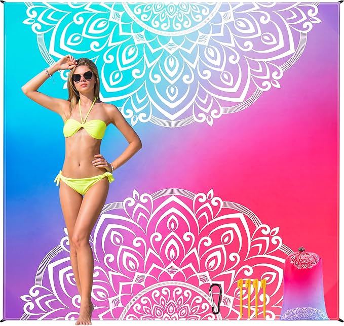 - 🐢WIND RESISTANT- Our sand-resistent beach blanket with 4 integrated sand corner pockets and 4 anchors stakes, provides dual wind-resistant protection to keep the blanket on the ground.