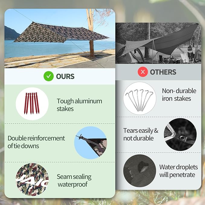 - High-quality complete set of accessories: One set can fulfill your camping needs without having to buy any other items. Package includes 1 tent tarp with 19 webbing straps, 6 rust-proof aluminum ground pegs, 8 adjustable nylon ropes, 1 ultralight carry bag for all your belongings, plus a super handy extra carry bag for accessories.