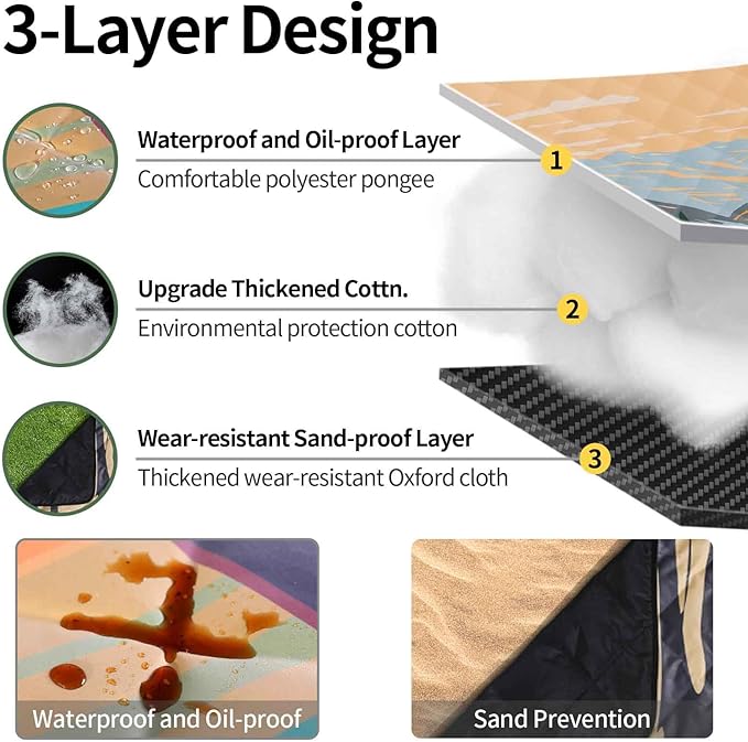 - 【Three-layer Structure】 We understand the importance of comfort and moisture resistance for outdoor activities. Therefore, the picnic mat adopts a three-layer design: the top layer is waterproof, the middle layer is soft cotton, and the bottom layer is also waterproof. This structure not only ensures the comfort of the cushion but also provides moisture resistance, allowing you to always enjoy a dry and comfortable sitting posture.