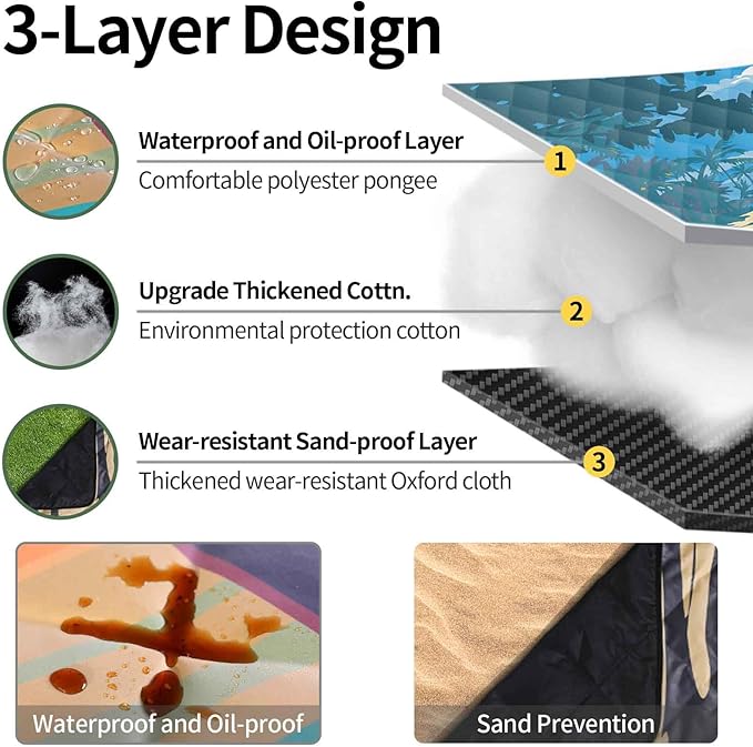 - 【Three-layer Structure】 We understand the importance of comfort and moisture resistance for outdoor activities. Therefore, the picnic mat adopts a three-layer design: the top layer is waterproof, the middle layer is soft cotton, and the bottom layer is also waterproof. This structure not only ensures the comfort of the cushion but also provides moisture resistance, allowing you to always enjoy a dry and comfortable sitting posture.