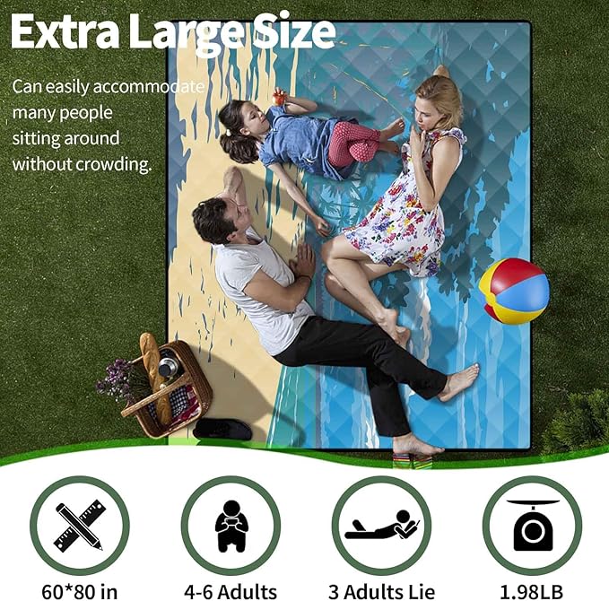 - 【Extra Large Picnic Blankets Size】 Our picnic blanket has an unfolded size of 60*80 inches, which is spacious enough to accommodate 4-6 adults. Whether you're spending quality time with family, friends, or loved ones, this wide area will provide enough space for everyone to enjoy the outdoor picnics.