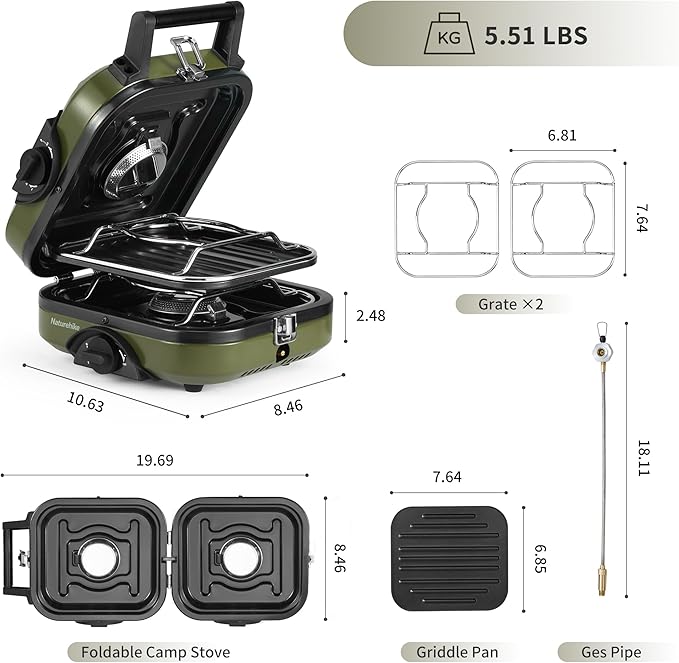 - [PORTABLE & MULTIFUNCTIONAL] Naturehike folding camp stove folds like a small handbag. (folding size: 10.6” x 8.5” x 5.1” weight: 5.5 lbs) You don't need to bring an extra frying pan. This 2 in 1 camping stove makes cooking easier with it’s built in griddle.