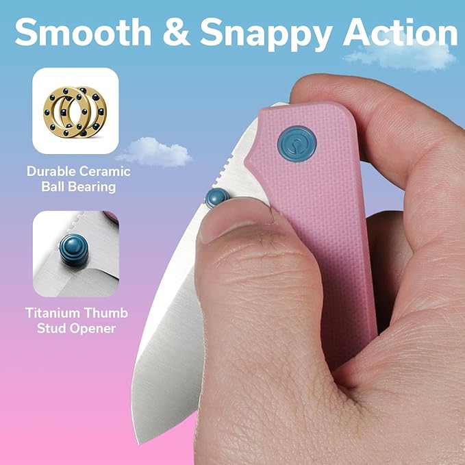 - Smooth & Snappy Action --- It rides on ceramic bearings, smooth, snappy deployment with titanium thumb stud opener.