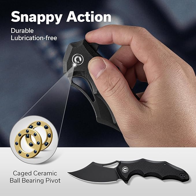 - Snappy Action --- Thanks to the durable, lubrication-free ceramic ball bearing pivot of the folding knife, the thumb hole and flipper opener provide smooth opening pleasure. The liner lock remains securely locked while performing tasks.