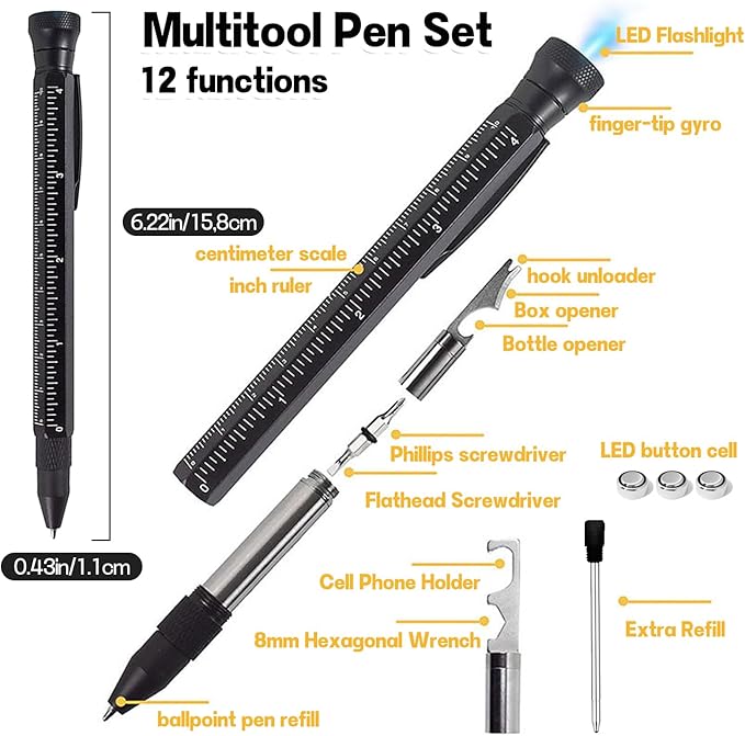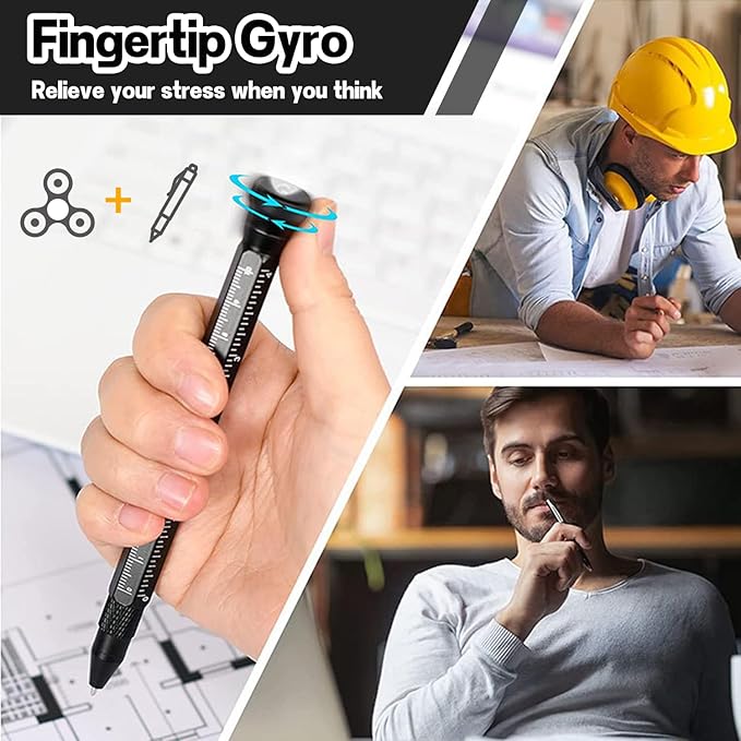 - 【Multi-purpose functions】—The multi-function tool pen has 11 very convenient functions: Fingertip gyroscope/ruler/screwdriver (flat head and cross head)/bottle opener/mobile phone holder/stylus pen/8mm hex wrench/LED flashlight/ Box opener. This cool men's gadget can be a unique gift for your husband/dad/father/man/boyfriend/him.