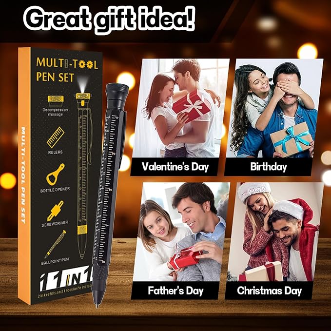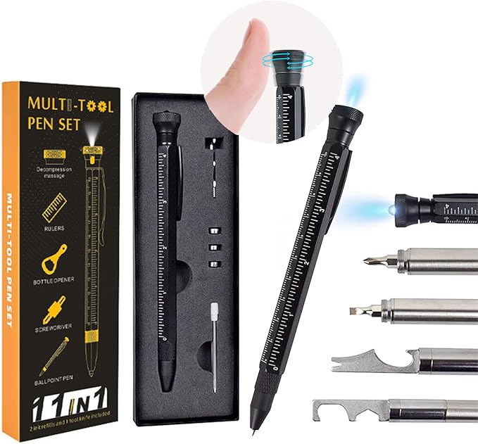 - 【11-in-1 Multifunctional Tool Pen Set】—This 11-in-1 tool pen is beautifully packaged, perfect for giving to your loved ones as a birthday gift, Christmas gift, Father's Day gift. When your loved one receives such a personalized gift, they will give you an excited smile.