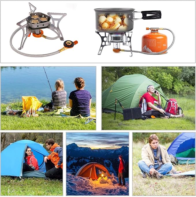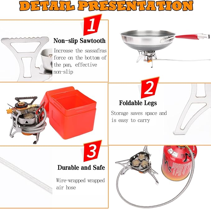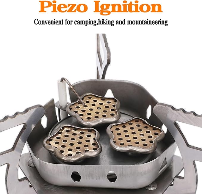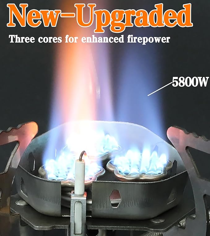- 🔥【3 Burner Cores & Piezo Ignition】3 burners cores with 5800w. Boils a pot of water in no time. The integrated design of the wind shield can effectively improve the thermal efficiency of the stove. Simply screw the canister on and press the ignition switch to ignite ; no additional flint is required.