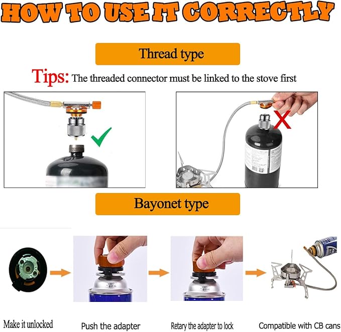 - 🔥【COME With 2 TYPES ADAPTER】 Our camp stove is not only compatible with camping 8 oz fuel canister, 7/16 threaded monobutane/butane canister , but also compatibale with 1 Lb Propane Small Tank Input EN417 lindal valve output. You need to use the right camping stove adapter which we provided.