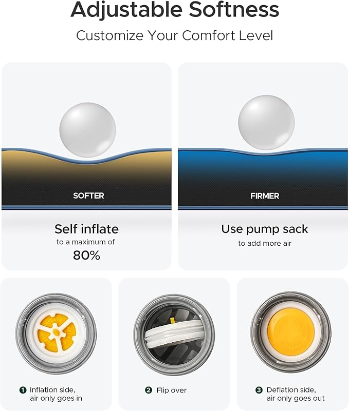 - Quick Inflation & Custom Softness: The 2-way valve design automatically handles most inflation and deflation. The carry bag doubles as a pump sack allowing you to adjust air volume for customized softness easily. For even faster inflation, an electric air pump (sold separately) is recommended