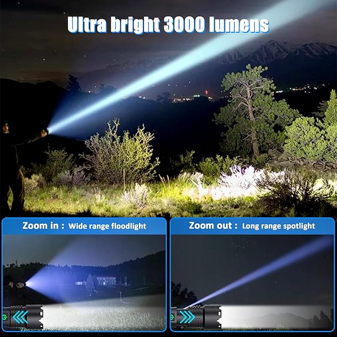 - 🔦 【Super Bright Flashlight】Each LED rechargeable flashlight is equipped with the newly chip, can providing real 3000lm light output. This tactical flashlight is 3 times brighter than other flashlight.