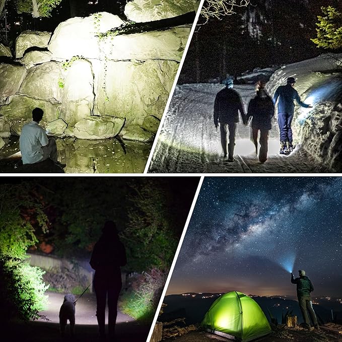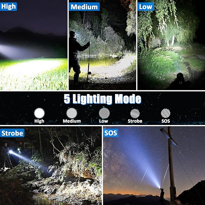 - 🔦 【Zoomable Flashlight & 5 Light Modes】: This multifunctional rechargeable flashlight has 5 modes: low, medium, high, SOS, and strobe. Long press for 10 seconds to turn off the light, no need to cycle all light modes. Adjust floodlight or spotlight by pushing/pulling the head of the flashlight.