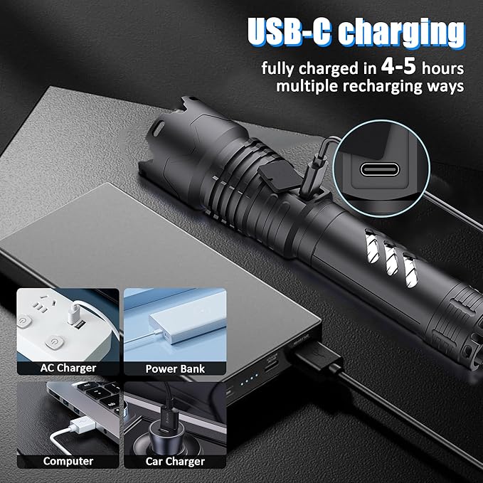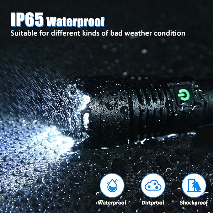 - 🔦 【IP65 Waterproof Flashlight】 - Tactical flashlights high lumens rechargeable is made of military-grade aluminum alloy. High lumens rechargeable flash light is IP65 waterproof. Super bright flashlight add waterproof rubber ring at the charging port and lamp head, you can use it in rain or other bad wather.