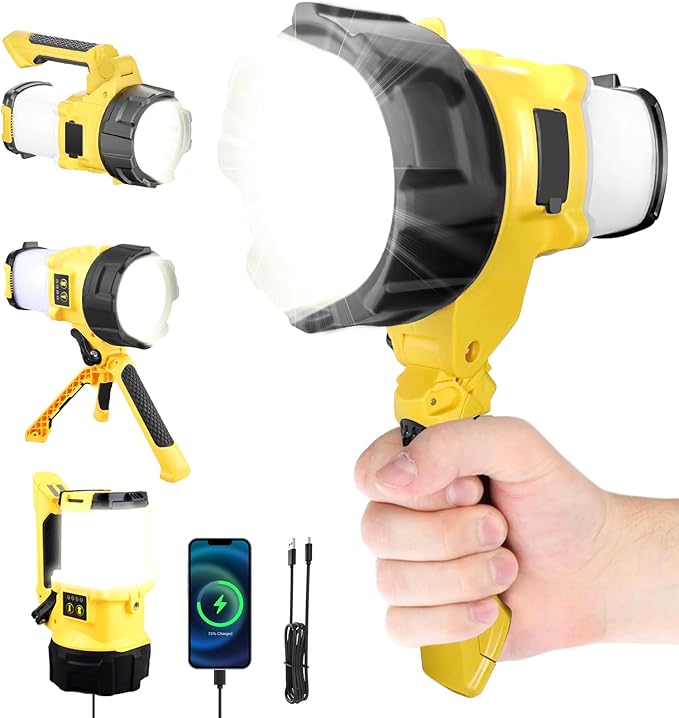 3-in-1 Rechargeable Spotlight with Adjustable Handle, IP65 Waterproof Handheld LED Flashlight Searchlight Work Light, 4400mAh Power Bank, 6 Light Modes for Emergency Hurricane Outdoor Hiking Camping
