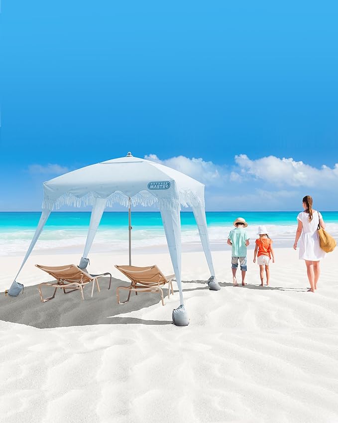 - UV50+ Protection Shade for 4 Person: Beach cabana with fringes, adds romantic moments to your vacation. The detachable side wall blocks angled sunlight for extra shade and privacy. Featuring UPF 50+ sun protection, it shields your skin from harmful UV rays and prevent sunburn - perfect for families, kids.
