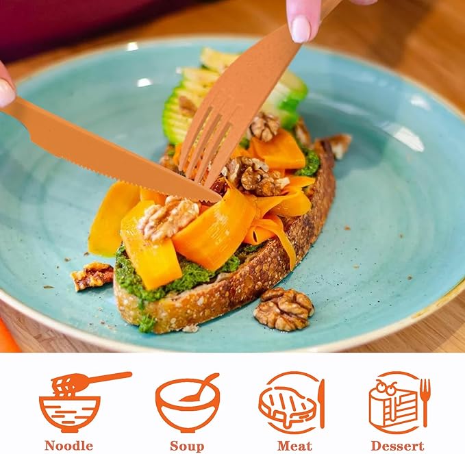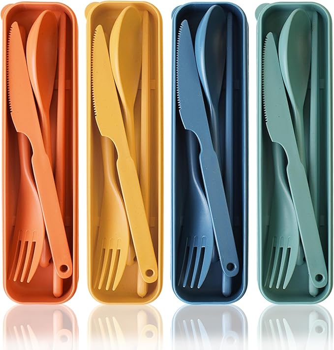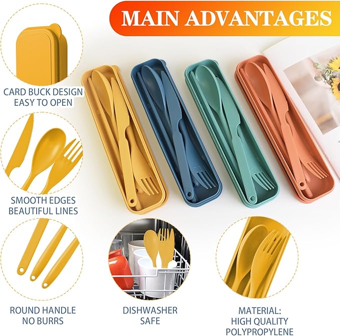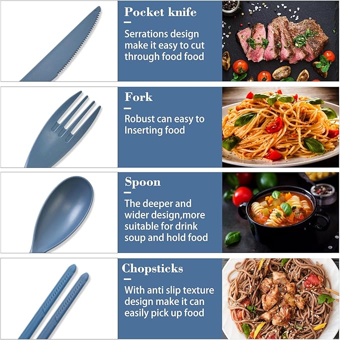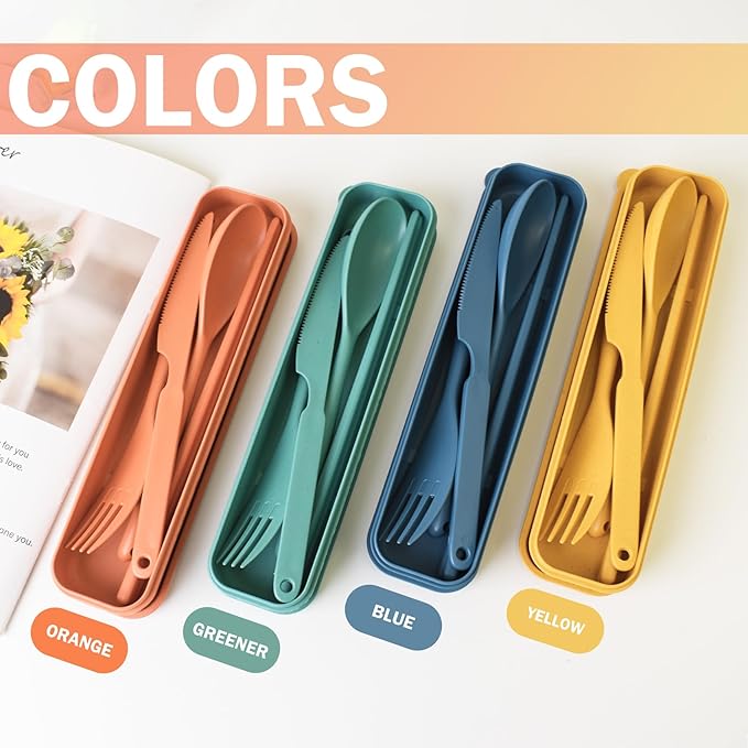- 【Material and Portability】Our travel utensils are made of high quality plastic and reusable. Traditional stainless steel cutlery is too heavy and difficult to carry. Our colorful sets of flatware sets are small and lightweight for easy portability.