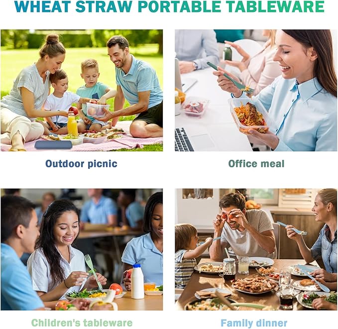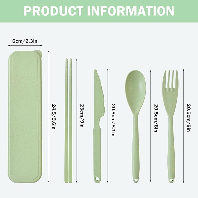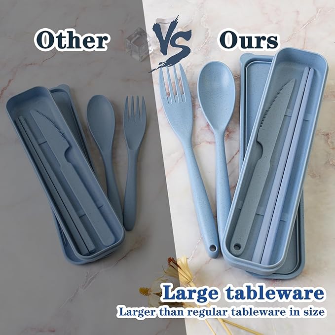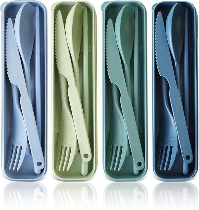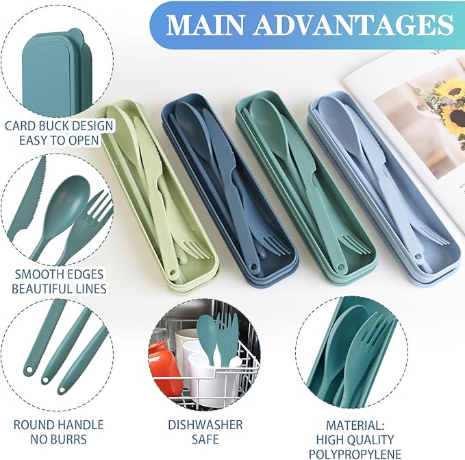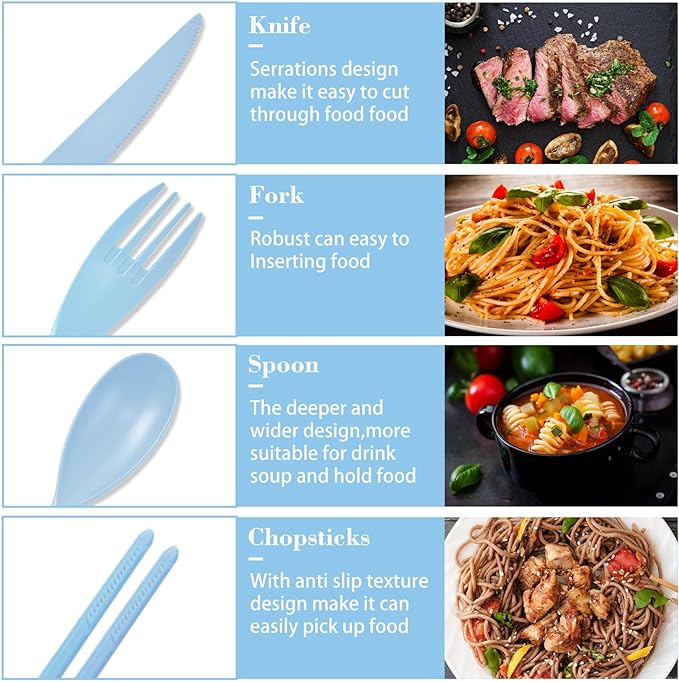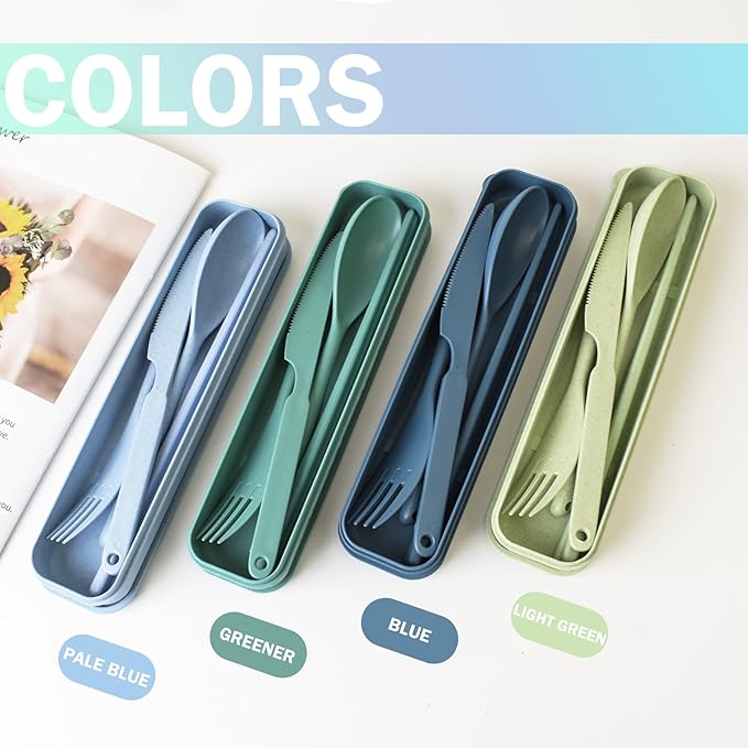 - 【Material and Portability】Our travel utensils are made of high quality plastic and reusable. Traditional stainless steel cutlery is too heavy and difficult to carry. Our colorful sets of flatware sets are small and lightweight for easy portability.