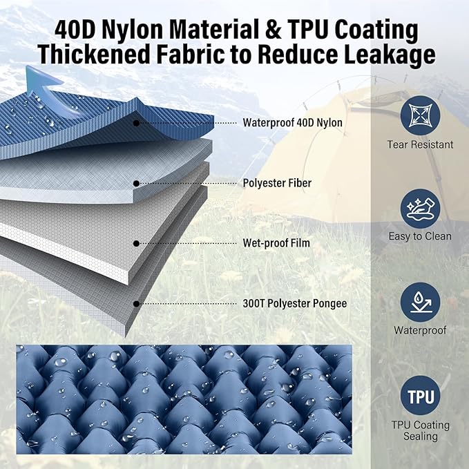 - ☀【Durable Ripstop Fabric for Outdoor Use】Made of thicker 50D and 300T polyester pongee material, the camping mattress is wear-resistant and waterproof, no more worry about to be scratched or tore. These fabrics are firm enough to endure the hard terrains and cold weather. It is the most suitable camping gear for your camping trips.