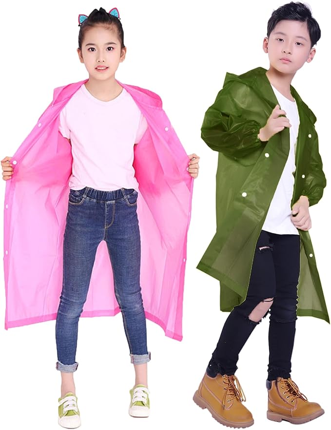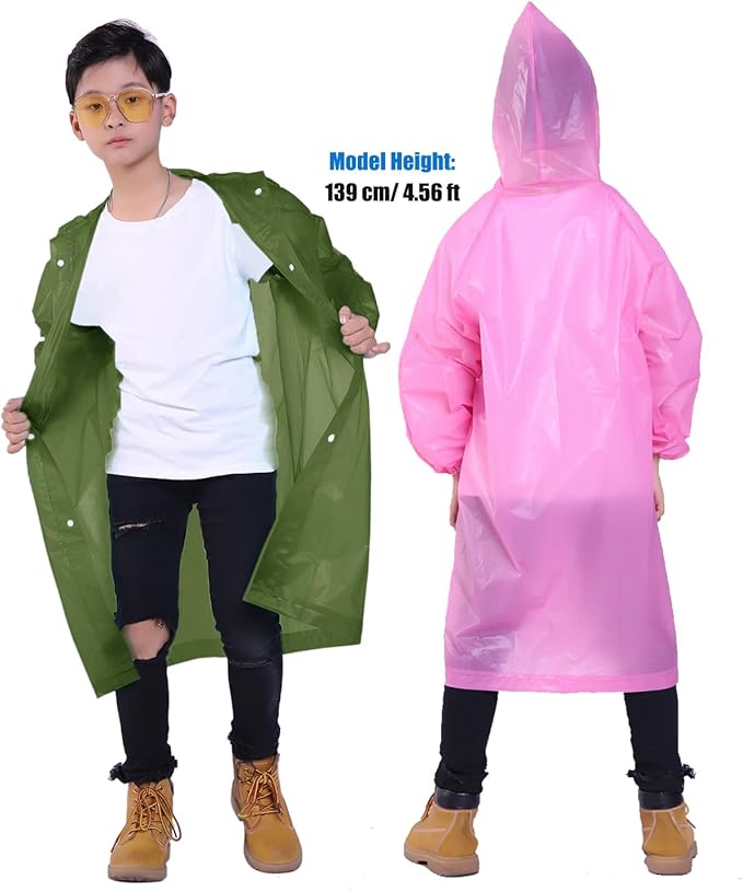 - Compact Emergency Protection: Our raincoat for girls and boys features a large hood, long sleeves, elastic cuffs, and snap buttons to keep you cool and dry in heavy rain. Easy to put on or take off, and fold for reuse. It saves space and reducing waste