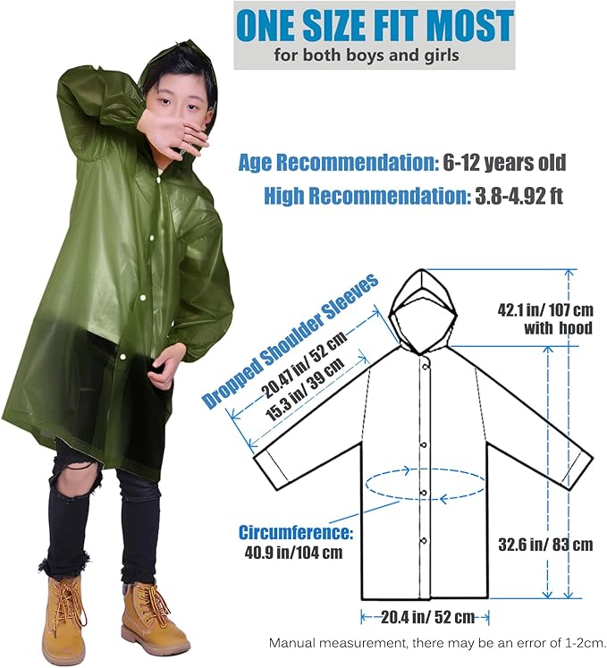 - One Size Fits Most: Measures 42.1" x 20.45" with a hood, suitable for children between 3.8-4.92 ft tall (typically ages 6 to 12). Confirm fit before ordering. For safety reasons, Makonus ponchos for kids are designed without drawstrings