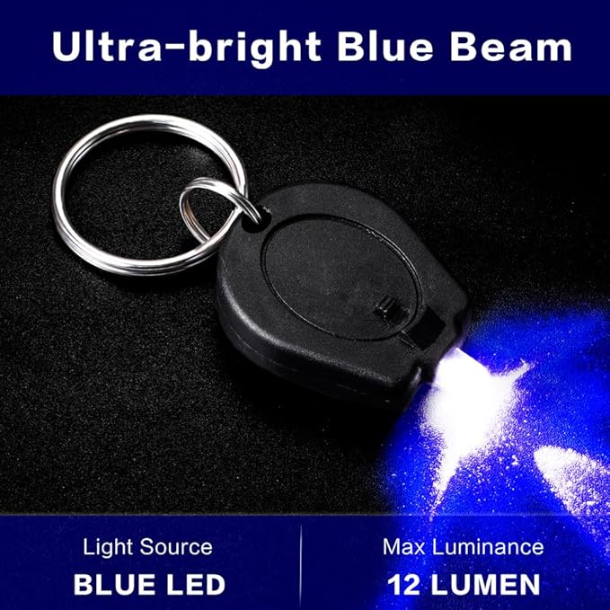- Lightweight and Handy Keychain Blue Light: The size of the keychain blue LED flashlight is like a quarter, It's only 0.28OZ weight. It's very convenient to attach to the keychain, dog collar, zipper, backpack, hiking or camping devices and so on, it can be the easiest nearby emergency blue light to get.