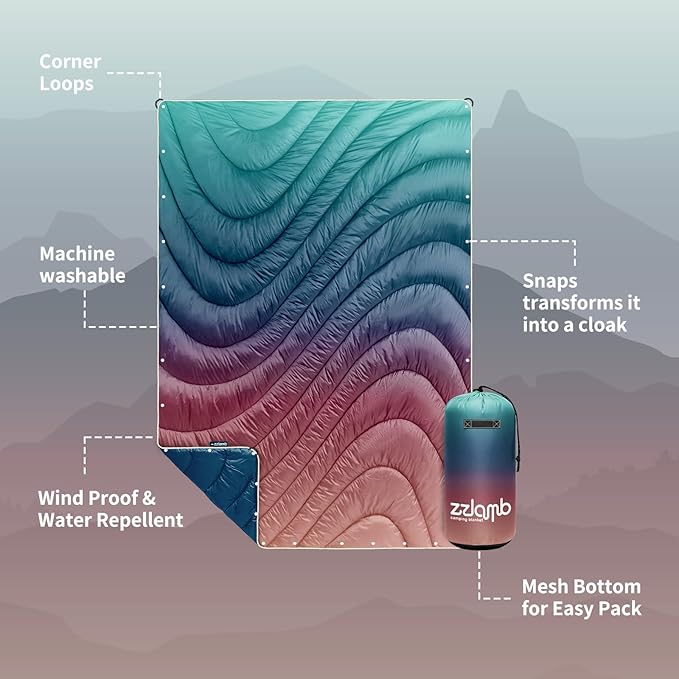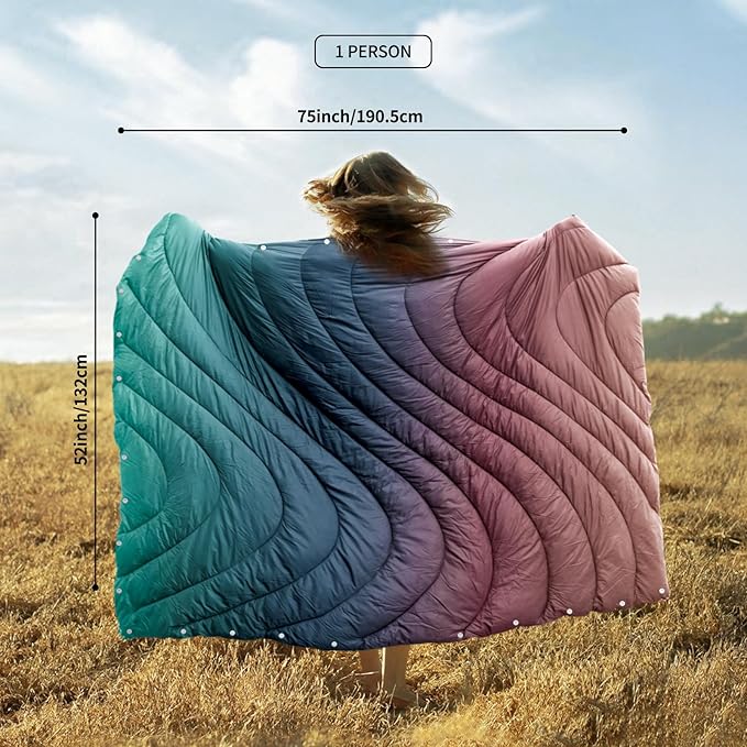- Functional Designs: The poncho clip or snaps design could transform the puffy blanket into a cloak and make your hands available while you are drinking, eating, chatting or doing some campsite tasks and still keep you warm. Loops at the four corners allow you to stake the camping blanket into the ground and you can use it as a picnic mat and lie down. Attention: two versions of quilted lines are sent in random. Please kindly accept it