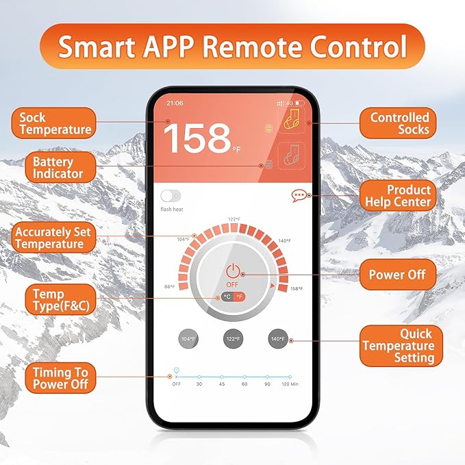 - 【𝐀𝐏𝐏 𝐂𝐨𝐧𝐭𝐫𝐨𝐥 & 𝐄𝐚𝐬𝐲 𝐭𝐨 𝐎𝐩𝐞𝐫𝐚𝐭𝐞】JUSTWILL rechargeable heated socks include a bluetooth remote APP to control the temperature settings of both socks,so you don’t have to hike up your pant legs, and find the on/off button while you are fishing/skiing in frigid weather.You also can use switch button to adjust the heating level ,the function is conveniently straightforward,all you do is press the button to turn it on, then adjust the temperature as needed.