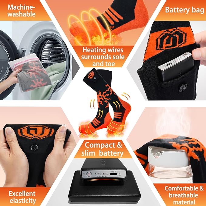 - 【𝐂𝐨𝐦𝐟𝐨𝐫𝐭𝐚𝐛𝐥𝐞, 𝐖𝐚𝐫𝐦 & 𝐔𝐬𝐞𝐫-𝐟𝐫𝐢𝐞𝐧𝐝𝐥𝐲】Our heated socks creatively blends heating wire and fabric perfectly, besides being comfortable, nice touch,and warm, you will not feel the heating elements.With soft breathable and stretchy with excellent cushioning material,the rechargeable heated socks are a nice thickness that isn't too thick or too thin, so they will not bunch up or cause chafing. Compact & slim battery with streamlined design,can be put into a pocket, is secure.