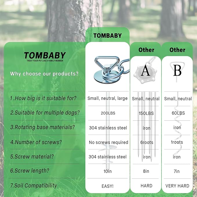 - FREE YOUR HANDS: The TOMBABY dog stake is a great helper to help you free your hands when you go to the park and camp out. Let your dog play happily even outdoors.f you have any question please contact us through “Contact Sellers” and we will provide service to help solve any of the problems