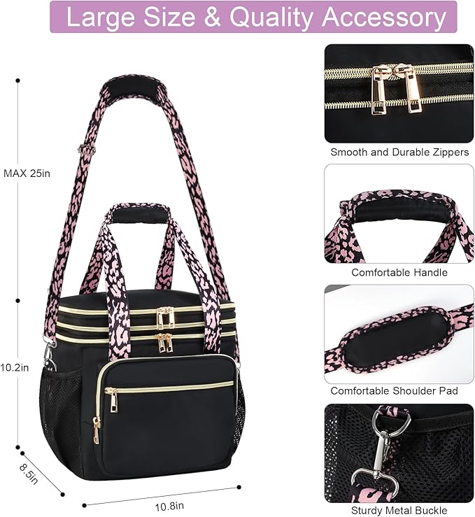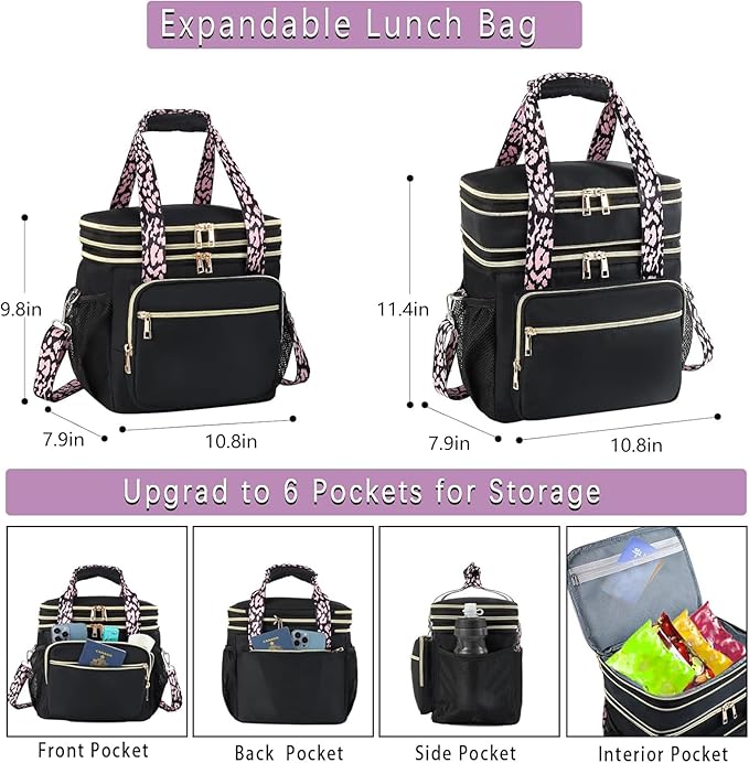 HSHRISH Expandable Lunch Box for Women, Double Deck Large Insulated Lunch Bag Women Leakproof Durable Lunch Cooler Tote Bag, Lightweight Cute Lunchbox for Work Outdoor Travel, Black