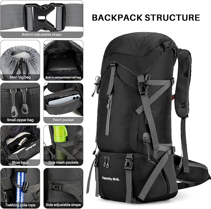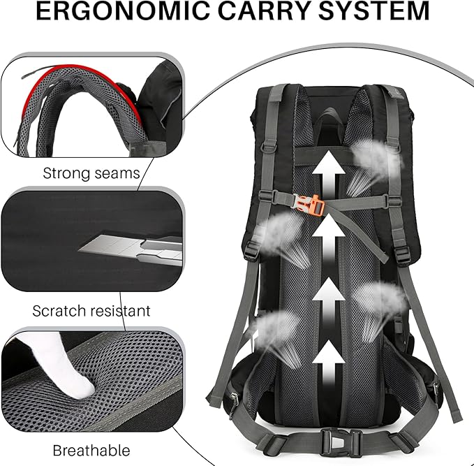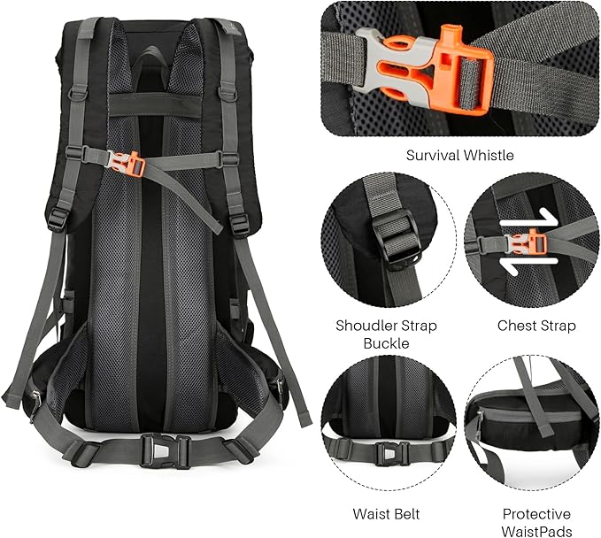 - 🎒Convenience & Ergonomic: Long trips are no longer a pain with our backpack's ergonomic design that evenly distributes weight, breathable mesh for ventilation, and adjustable chest and waist straps. Our camping backpack has enough compartments for everything you need, keeping your items safe
