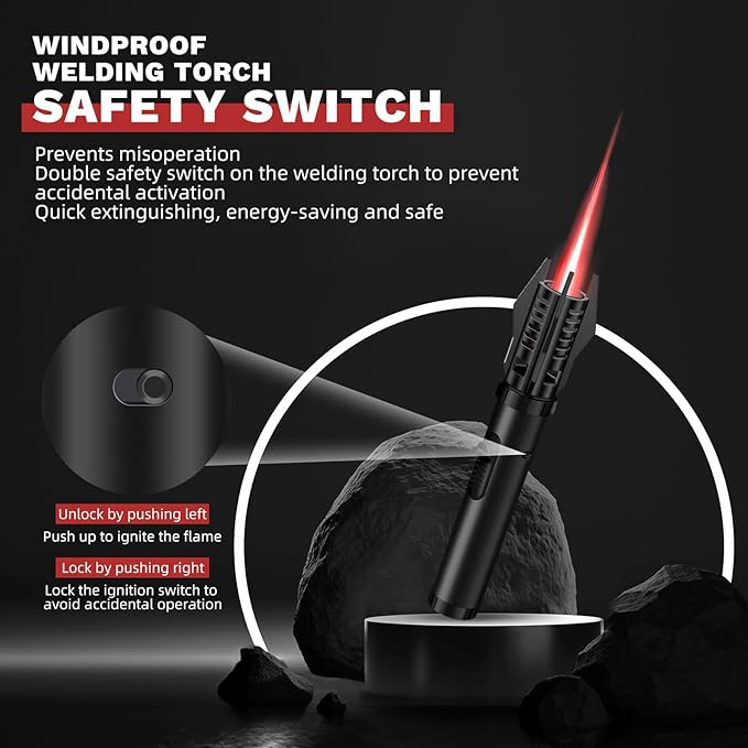 - Safety- The safety insurance switch ensures that the flame is ignited only when intended, providing peace of mind during use. Push right to lock, push left to unlock, push up to open the switch to ignite the flame. This lighter combines ceramic insulation with a rugged metal body to withstand the rigors of duty, ensuring long-term reliability. And it can keep the torch output while using, making it a safe and reliable lighter for all your culinary and ignition needs.